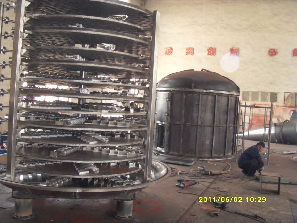 濕物料自加料器連續(xù)地加到干燥器上部干燥盤上,帶有耙葉的耙臂作回轉(zhuǎn)運(yùn)動使耙臂作回轉(zhuǎn)運(yùn)動使耙葉連續(xù)地翻抄物料。物料沿指數(shù)螺旋線流過干燥盤表面,在小干燥盤上的物料被移送到外緣,并在外緣落到下方的大干燥盤外緣,在大干盤上物料向里移動并從中間落料口落如下一層小干燥盤中。大小干燥盤上下交替排列,物料得以連續(xù)地流過整個(gè)干燥器。中空的干燥盤內(nèi)通入加熱介質(zhì),加熱介質(zhì)形式有飽和蒸汽、熱水和導(dǎo)熱油,加熱介質(zhì)由干燥盤的一端進(jìn)入,從另一端導(dǎo)出。已干物料從后一層干燥盤落到殼體的底層,后被耙葉移送到出料口排出。濕份從物料中逸出,由設(shè)在頂蓋上的排濕口排出,真空型盤式干燥器的濕氣由設(shè)在頂蓋上的真空泵口排出。從底層排出的干物料可直接包裝。通過配加翅片加熱器、溶劑回收冷凝器、袋式除塵器、干料返混機(jī)構(gòu)、引風(fēng)機(jī)等輔機(jī),可提高其干燥的生產(chǎn)能力,干燥膏糊狀和熱敏性物 料,可方便地回收溶劑,并能進(jìn)行熱解和反應(yīng)操作。