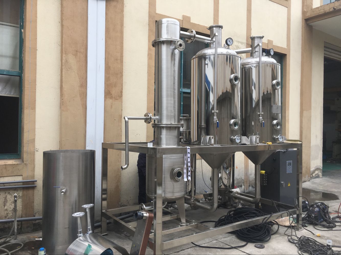效體內部為排列的細管,管內部為產品,外部為蒸汽,在產品由上而下的流動過程中由于管內面積增大而使產品呈膜狀流動,以增加受熱面積,通過真空泵在效體內形成負壓,降低產品中水的沸點,從而達到濃縮,產品蒸發溫度為60℃左右。