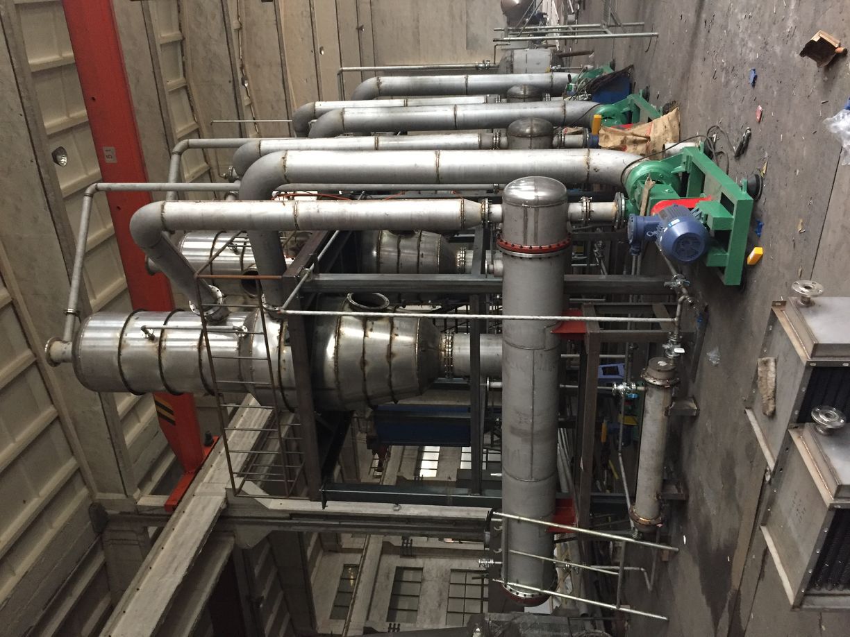 雙效蒸發(fā)器簡單的說就是兩個單效蒸發(fā)器串聯(lián)在一起,串聯(lián)的方式又分為并流、逆流、平流三種形式。加熱蒸發(fā)器、分離器、冷凝器、熱壓泵、保溫管、真空系統(tǒng)、料液輸送泵、冷凝排水泵、操作平臺、電器儀表控制柜及閥門、管路等系統(tǒng)組成。