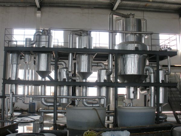本設備由各效加熱器、各效蒸發分離器、冷凝器(混分式或表面式、各效強制循環泵、各種料液輸送泵、真空泵、冷凝水泵、操作平臺、電器儀表控制柜及界內管道閥門等組成。