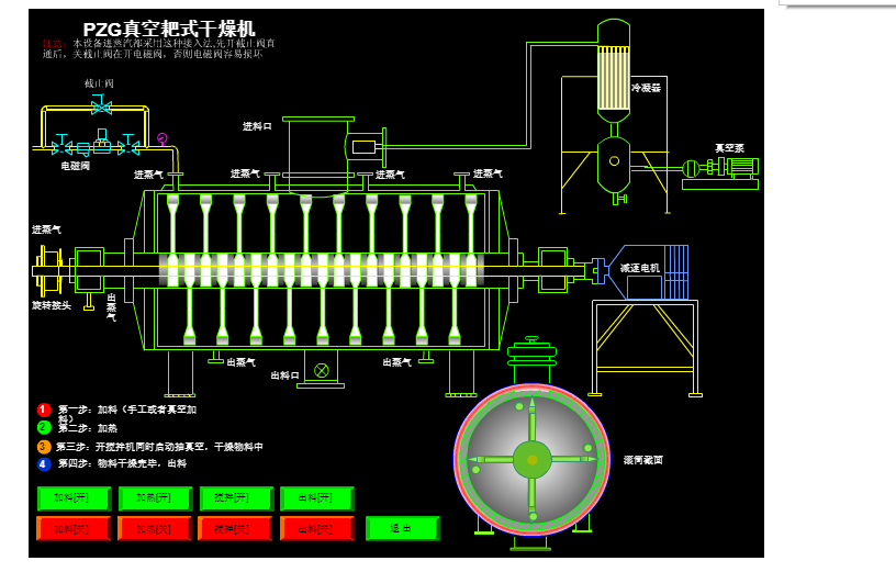 真空耙式干燥機操作簡單,進出物料方便,大幅度減輕了工人勞動強度,同時也減少了物料在干燥過程中受到的環境污染,提高了產品質量,符合藥品管理規范“GMP”的要求。