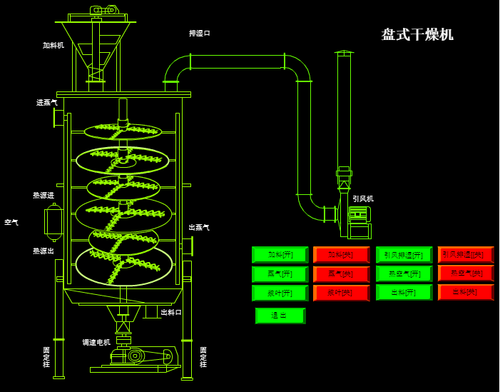 濕物料自加料器連續地加到干燥器上部干燥盤上,帶有耙葉的耙臂作回轉運動使耙臂作回轉運動使耙葉連續地翻抄物料。物料沿指數螺旋線流過干燥盤表面,在小干燥盤上的物料被移送到外緣,并在外緣落到下方的大干燥盤外緣,在大干盤上物料向里移動并從中間落料口落如下一層小干燥盤中。大小干燥盤上下交替排列,物料得以連續地流過整個干燥器。中空的干燥盤內通入加熱介質,加熱介質形式有飽和蒸汽、熱水和導熱油,加熱介質由干燥盤的一端進入,從另一端導出。已干物料從后一層干燥盤落到殼體的底層,后被耙葉移送到出料口排出。濕份從物料中逸出,由設在頂蓋上的排濕口排出,真空型盤式干燥器的濕氣由設在頂蓋上的真空泵口排出。從底層排出的干物料可直接包裝。通過配加翅片加熱器、溶劑回收冷凝器、袋式除塵器、干料返混機構、引風機等輔機,可提高其干燥的生產能力,干燥膏糊狀和熱敏性物 料,可方便地回收溶劑,并能進行熱解和反應操作。